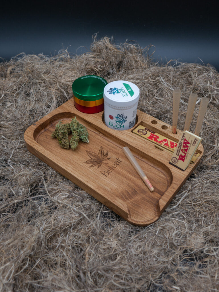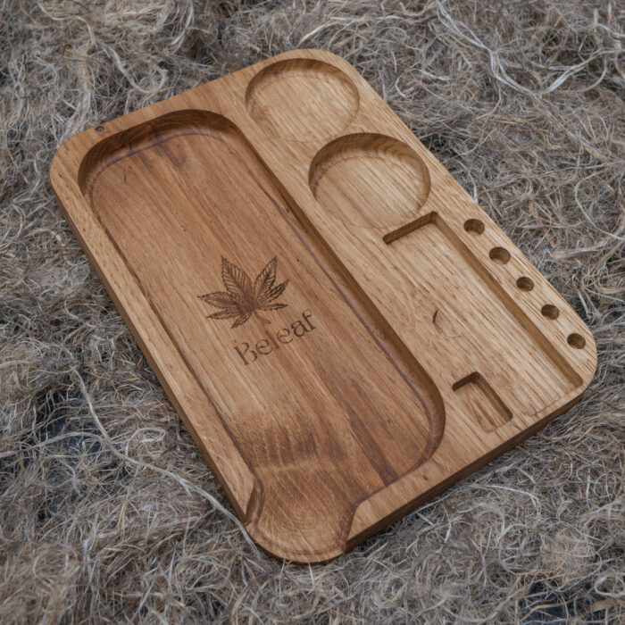 Tacka wykonana jest z najwyższej jakości drewna dębowego. Posiada miejsce na bongo, grinder o średnicy do 60 mm, bibułki, zapalniczki, a także susz. Dzięki niej wszystko, co potrzebne, będzie w jednym miejscu